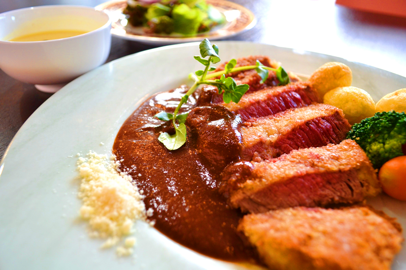 【下中】レストラン&カフェFujiで頂ける月膳(如月)は、お値打ちメニューの一つ。『土日限定!ヤングマンステーキ250g』(ライス・サラダ付2,000円)もリピーター続出の人気メニュー。
