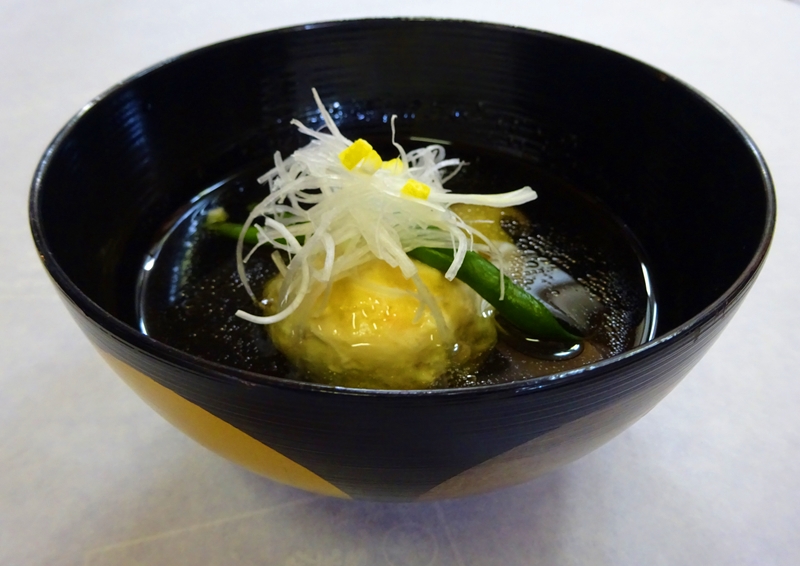【下左】たっぷりの白髪ねぎとともにいただく甘海老真丈(椀物)。見た目も味も抜群の一品。