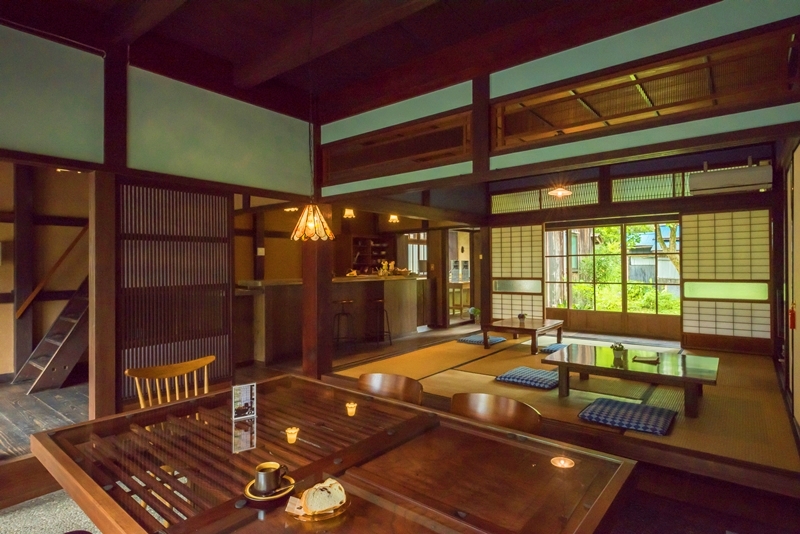【下中】旧山田家を改築した店舗。オーナーと話ができるカウンターと雰囲気のある座敷。テーブルは、蔵の扉をリメイクしたものだ。